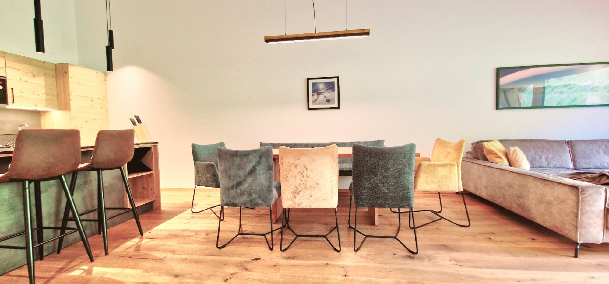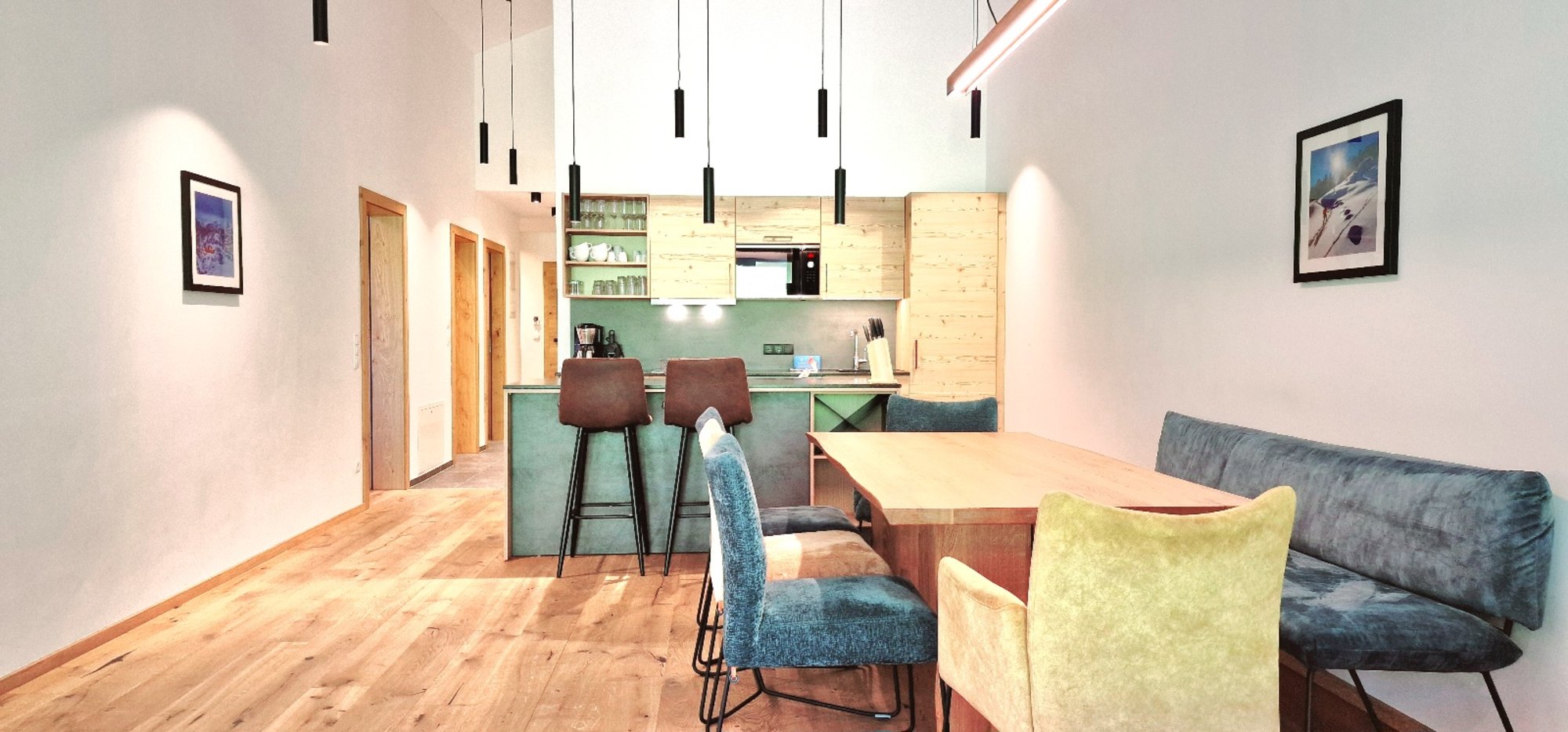Das nach einem Open Living Konzept eingerichtete Appartement besticht durch Stil und Zweckmäßigkeit. Die offene Küche verfügt über alle Annehmlichkeit und die Ansprüche modernen Wohnens. Kühlschrank, Mikrowelle, Backofen, Gefrierschrank, Spülmaschine, Geschirr/Besteck, Kochutensilien, Kaffeemaschine, Toaster und Wasserkocher findet man ebenso vor wie einen gemütlichen Ess- und Wohnbereich. In der warmen Jahreszeit wird die großzügige Loggia zu einem weiteren Wohnbereich. Mit einem Glas Rotwein in der Hand genießt man das atemberaubende Panorama der umliegenden Bergwelt. Ein Schwimmbad und ein hauseigener, gut ausgestatteter Gym befinden sich im Haus.